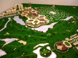 写真は新都市スターシティの模型。高層マンションの周りに学校、ショッピングモール、ゴルフ場などが配置され建設中です。